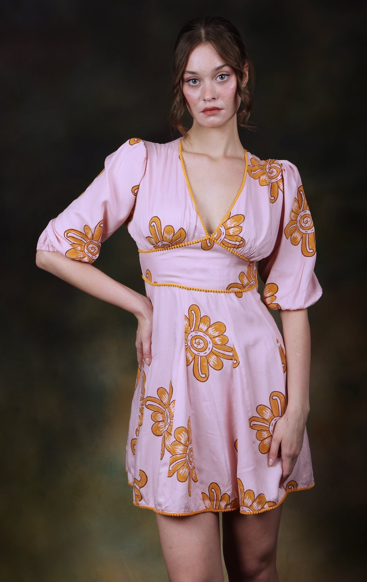 The Candy Skater Dress has a skater silhouette that moves easily and sits well the moment you put it on. The pink base with ochre floral motifs keeps the look playful, but never childish.