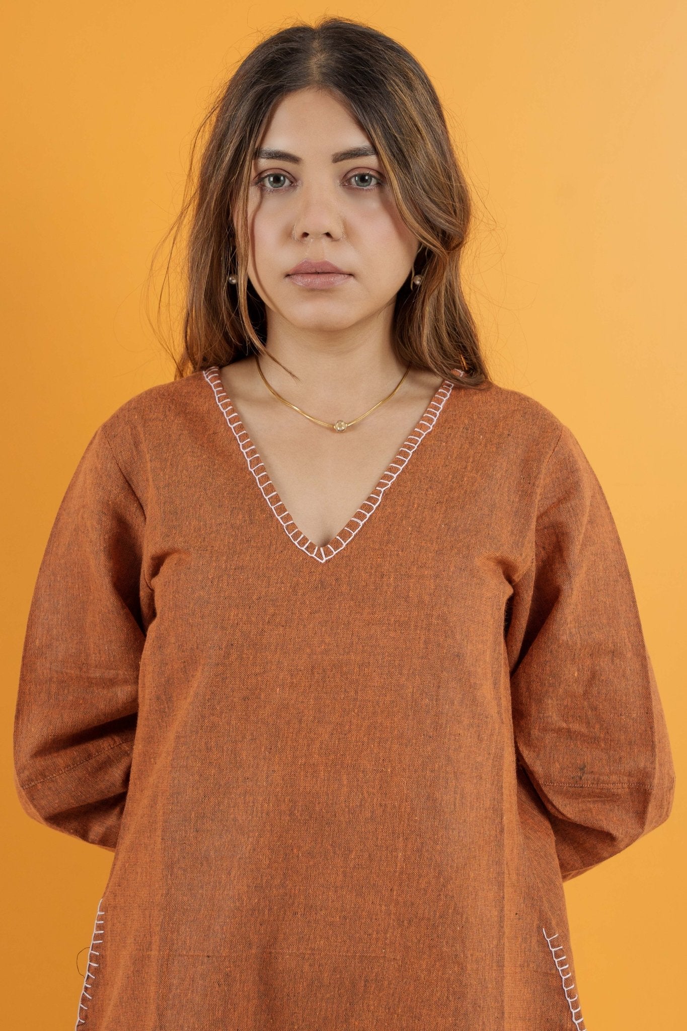 The burnt orange tone brings warmth and presence, while the midi length keeps the look grounded and composed. It feels intentional the moment you put it on, without needing styling tricks.