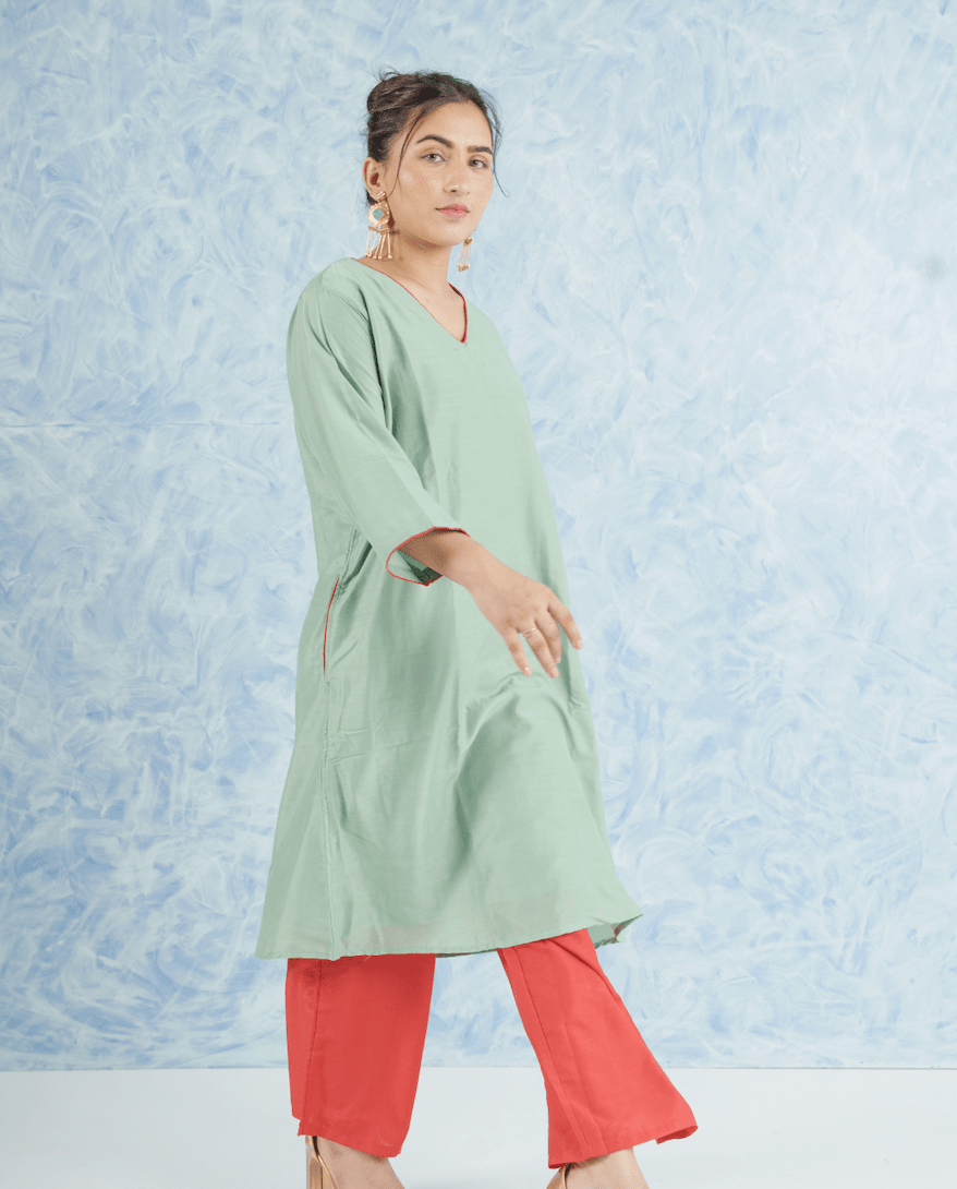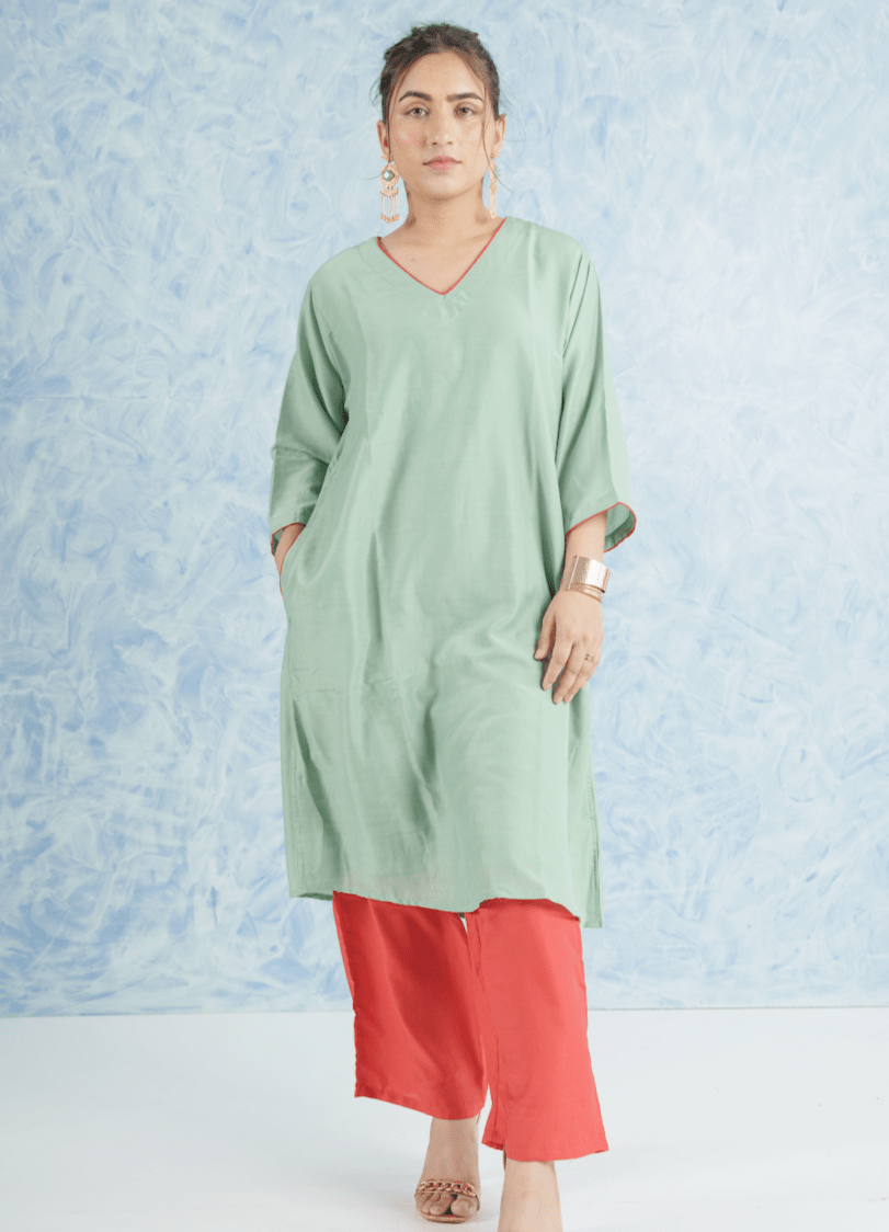 Elevate your summer wardrobe with the Sage Set, a perfect blend of style and comfort. This set includes a kurta and pant crafted from lightweight cotton muslin fabric, ensuring breathability even in the hottest weather. The Sage Set is hand-dyed in a soothing pastel green hue, evoking the freshness of spring, and features a contrasting red pant for a bold, stylish look. Detailed with fabric piping and two pockets, the set combines artisanal craftsmanship with practicality.